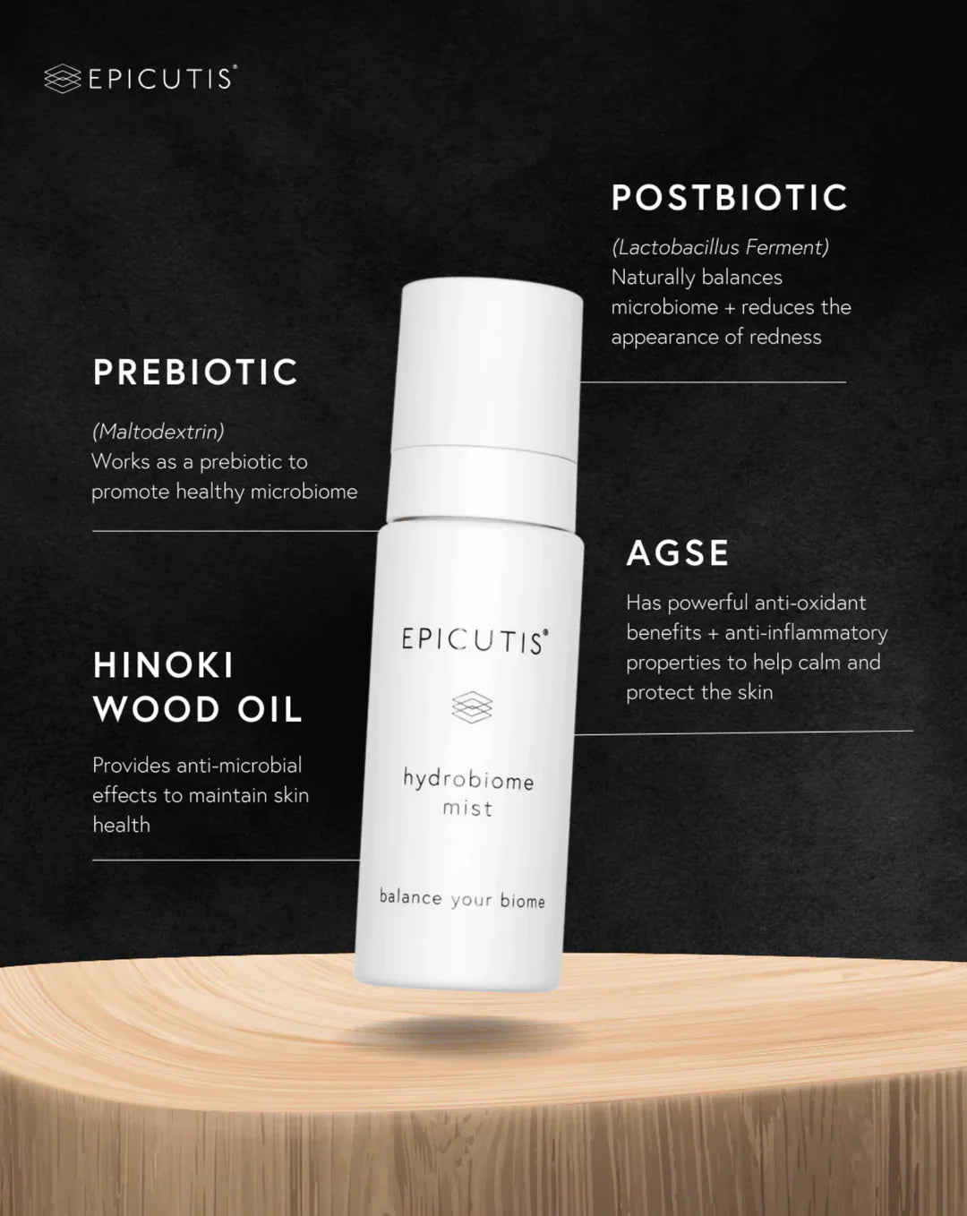 Refresh, hydrate, and protect your skin with the Epicutis Hydrobiome Mist—a science-driven formula designed to support a healthy skin microbiome. Powered by Activated Grape Seed Extract (AGSE) and Hinoki Wood Oil, this ultra-fine mist delivers deep hydration while reinforcing your skin’s natural barrier. Its antioxidant and antimicrobial properties help calm and protect, making it ideal for daily use, even after professional treatments. Use morning and night for balanced, resilient skin.